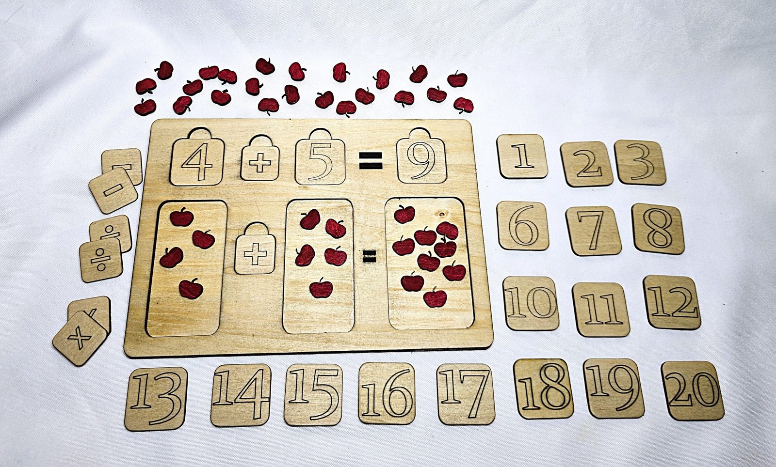 Transform math lessons into an engaging adventure with our interactive wooden math learning tool. Designed specifically for kids, this product introduces the fundamentals of addition, subtraction, multiplication, and division in a hands-on and enjoyable way. By using apple-shaped counters and number chips, children can assemble equations and visualize math concepts up to 20—and beyond if requested! It’s a fun, playful, and effective method to spark enthusiasm for math while ensuring a solid foundation.