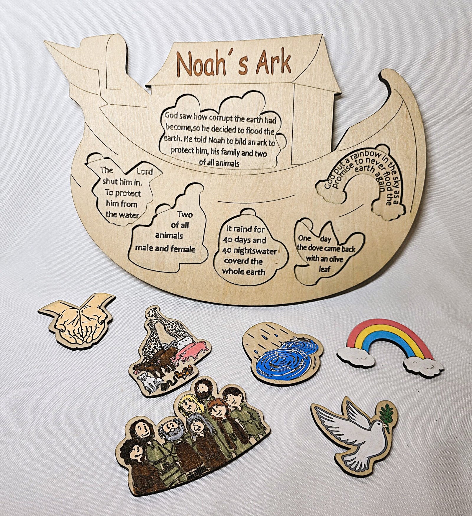 Elevate your Bible study with this charming and interactive wooden Noah’s Ark puzzle. Designed in the iconic shape of the ark, this unique puzzle not only provides a fun and engaging activity but also tells the complete story of Noah’s Ark beneath the puzzle pieces. Whether you’re teaching the story to children or exploring its meaning yourself, this puzzle offers a hands-on way to bring the tale to life.