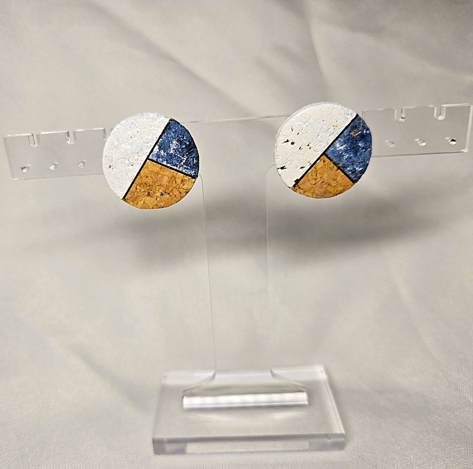 Crafted from repurposed wine corks, these stud earrings are lightweight yet durable, ensuring comfort for everyday wear without compromising quality. Each piece is hand-painted to achieve a marbled effect, making every pair distinct and one-of-a-kind. The touch of gold added to the design lends sophistication, creating earrings that are versatile enough for casual outings or formal gatherings.